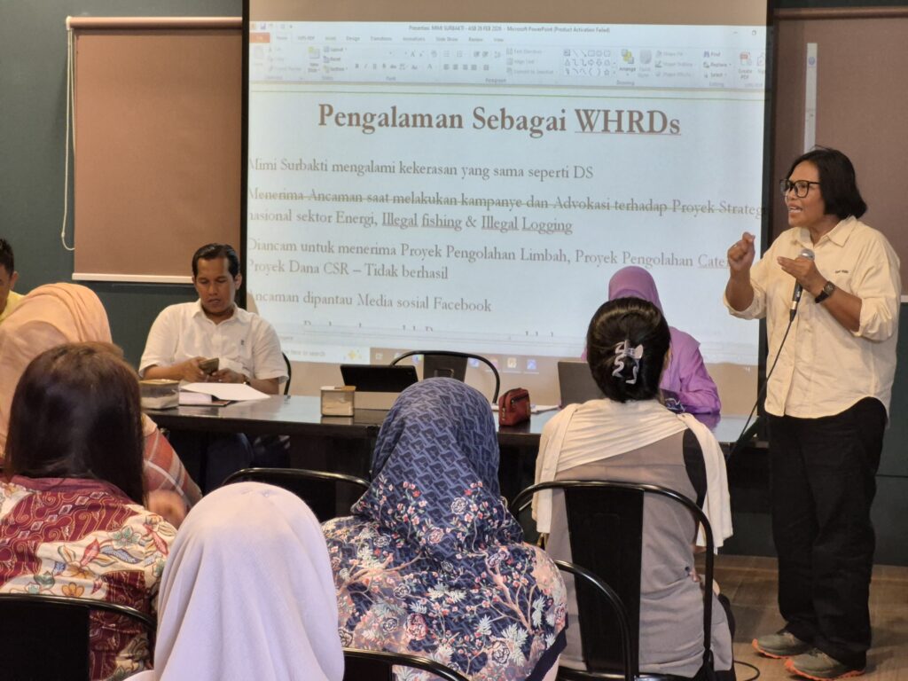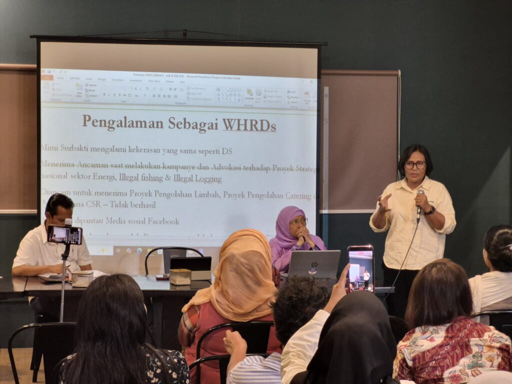 Direktur Yayasan Srikandi Lestari, Mimi Surbakti, yang menjadi salah satu narasumber, turut membagikan pengalamannya sebagai perempuan pembela HAM. Ia mengungkapkan pernah menerima ancaman pembunuhan, intimidasi melalui media sosial, hingga percobaan kekerasan terhadap staf lembaganya saat melakukan advokasi terkait proyek strategis nasional, ilegal fishing, dan illegal logging.