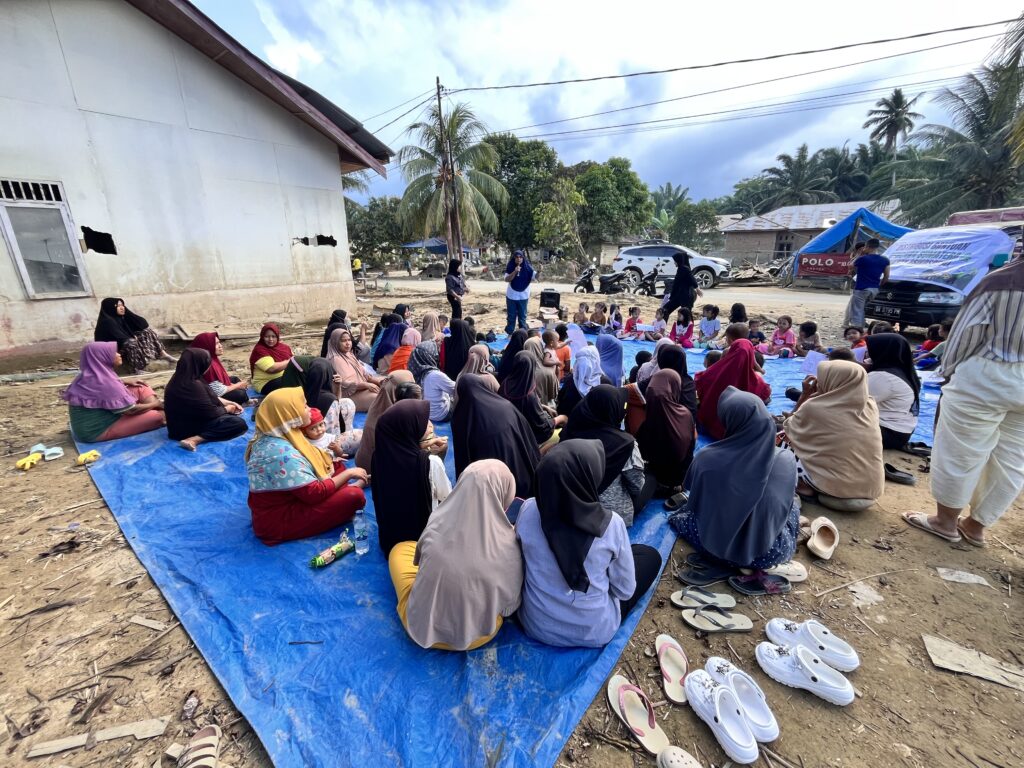 Selain edukasi, kegiatan ini juga menghadirkan pendampingan psikososial yang memberi ruang bagi perempuan untuk berbagi pengalaman dan mengungkapkan perasaan mereka setelah bencana. Dialog kelompok mendorong terbentuknya dukungan sosial antarwarga, sebuah elemen penting dalam proses pemulihan emosional.